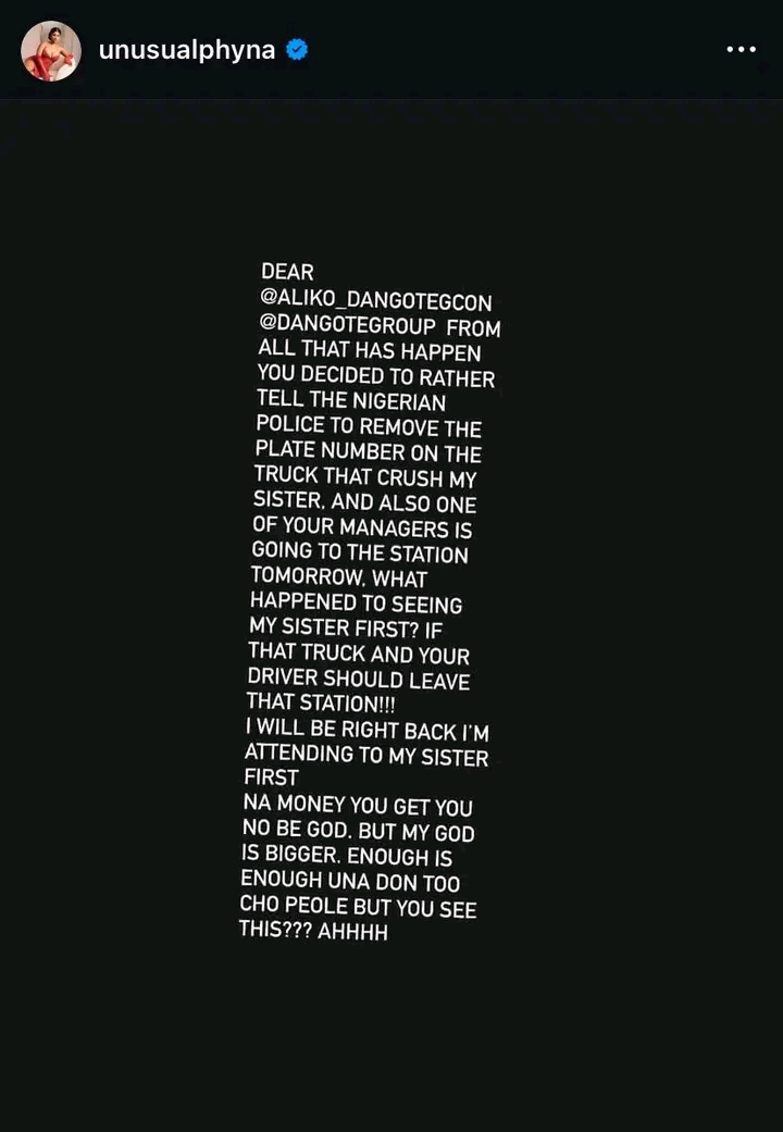 Tragedy struck in Auchi, Edo State, as Big Brother Naija winner and actress, Phyna, raised an alarm over a heartbreaking incident involving her younger sister, Ruth Otabor.According to Phyna, Ruth—who recently graduated from Auchi Polytechnic—was involved in a ghastly accident after being hit by a truck belonging to the Dangote company while she was on a bike.Eyewitnesses reported that the truck driver fled the scene after knocking down Ruth and the bike rider. However, a good Samaritan, who is also a lecturer at the polytechnic, gave chase and managed to apprehend the fleeing driver. He was eventually handed over to the police.In a disturbing twist, Phyna revealed that the truck’s plate number was allegedly removed at the station in what appeared to be an attempt to cover up the involvement of the Dangote group.